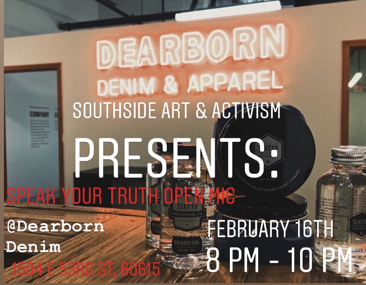 Joy Gabrielle, Hostess of Speak Your Truth Open Mic, speaking to attendees February 2019 was an important month. It was Black History Month. It was a crucial month for food stamp recipients, due to Donald Trump's negligence. It was mayoral and aldermanic election season and ended being the first time in Chicago History where a … Continue reading Speak Your Truth: Southside Arts and Activism